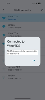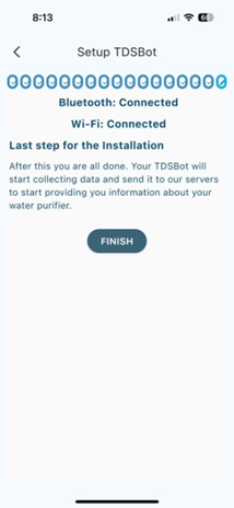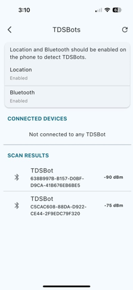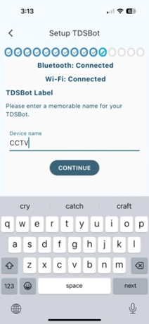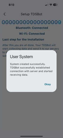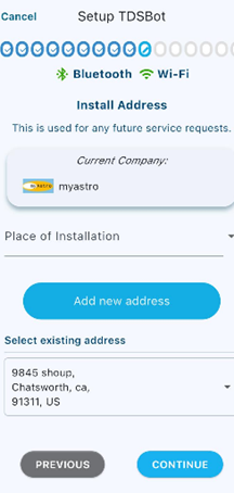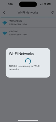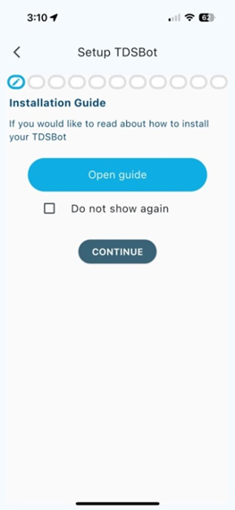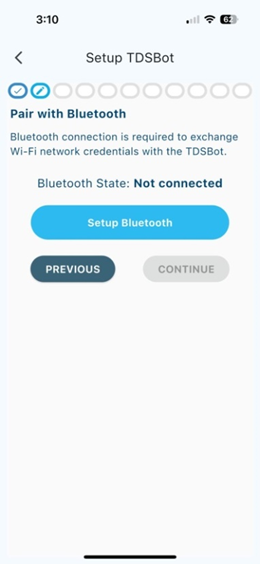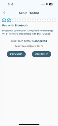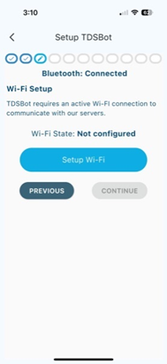 3] The next screen shows whether Bluetooth is connected and if not, we will pair the TDSBot to the APP. This step is needed to write the WIFI credentials to the TDSBot so it can send data to our backend server. Clicking on Setup Bluetooth opens a screen where the app shows the result of TDSBots that are available to be paired. Click on the TDSBot you wish to pair & initialize. After successful, the next screen will check if the TDSBot is available for installation. After that click on Continue to configure the Wi Fi setup. App scans available SSIDs. After you see your Wi-Fi SSID, select and enter the password. If successful you will see screen