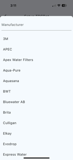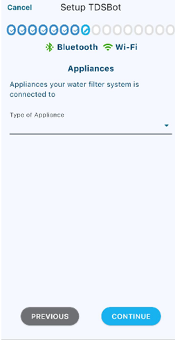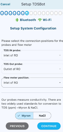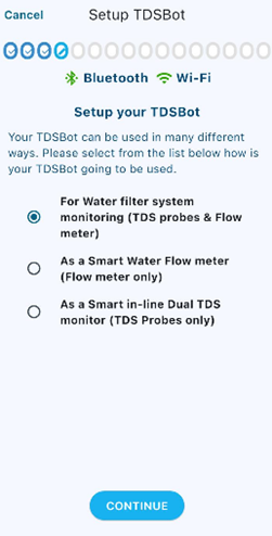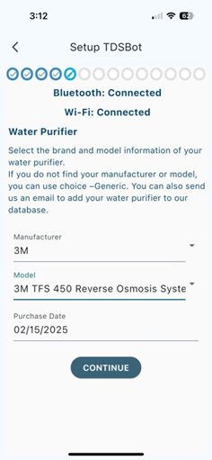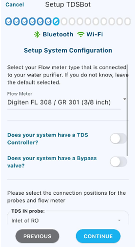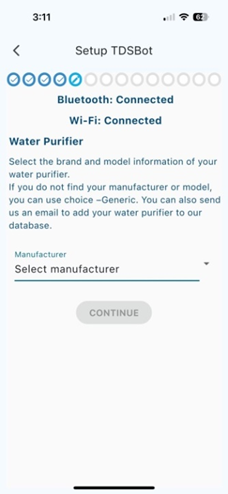 4] Next steps will guide you through configuring your water purifier or other use cases for the TDSBot. There are 3 ways you can use the TDSBot – Connected to a water purifier, Connected to a flowmeter only, Connected to 1 or 2 TDS probes only. Please select the appropriate use case. If you selected Connected to a water purifier, we will help you choose the right system. We are constantly adding more systems, so if you do not find your system, please support@watertds.com to get that added.