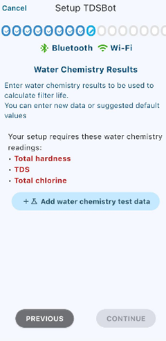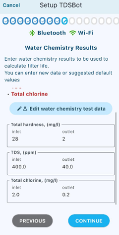 On the next screen we ask you to enter the appliance type the system is delivering water to. This will help monitor hardness, and other contaminants to be used for determining filter life and debugging system remotely. Next you have the opportunity to either enter manually tested water chemistry, rate of production, initial pressure etc. for your records and use for analytics and filter life calculations.