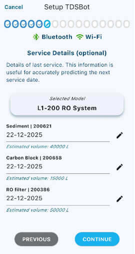 Based on the model of your system, additional parameters are presented for you to set up the system configuration – Default size/model of the flowmeter, type of constant to be used to convert the conductivity to PPM, position of probes. Enter water filter system last service details. (Used to calculate filter life left)